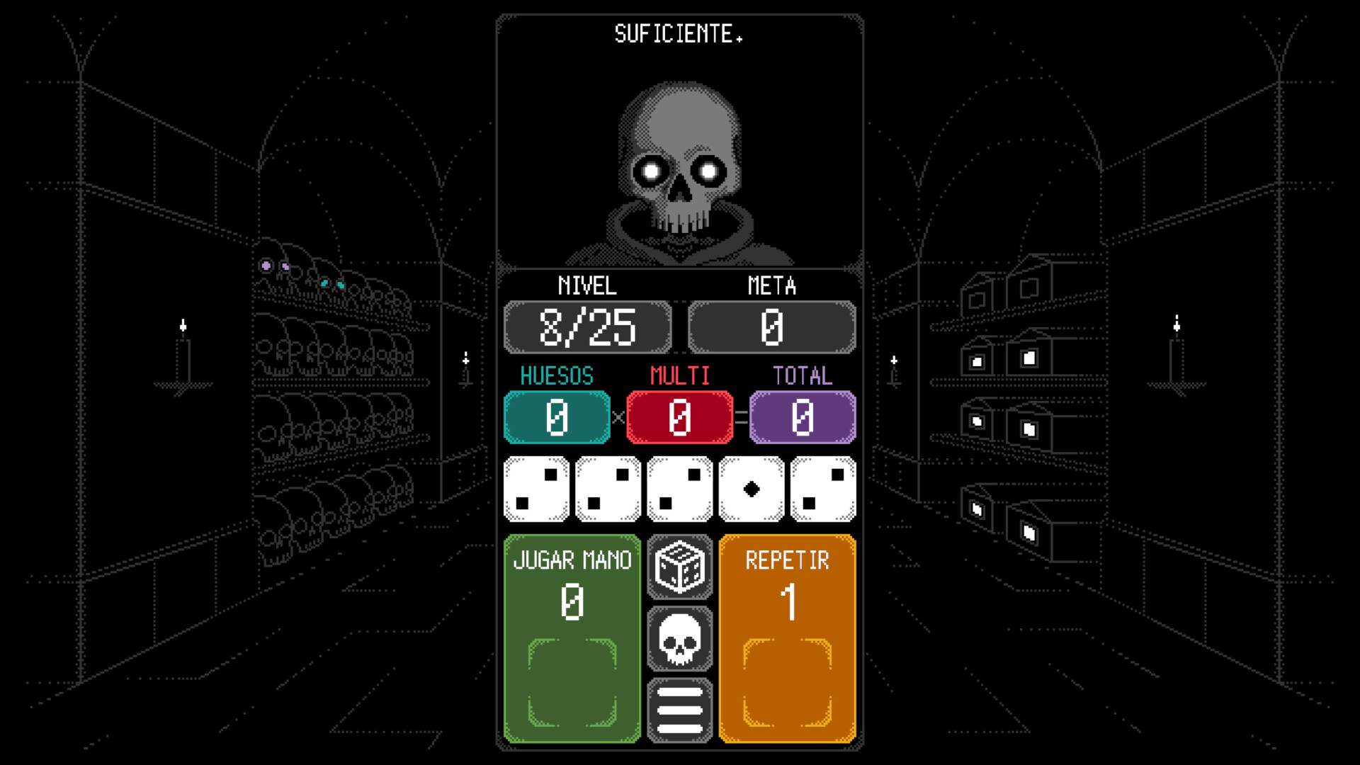 Al principio del juego nos presentarán la opción de hacer el tutorial, altamente recomendable, aunque el funcionamiento es bastante sencillo. Aparecerá una pantalla en la que encontraremos 5 dados que girarán y nos darán una mano que podemos usar para hacer puntos o la opción de cambiar alguno de los dados. También tendremos los huesos, que es la suma de todos los dados, estén en el combo o no. El multiplicador, que dependerá de la mano y otras cosas, nos dará una cantidad que puede superar o no al objetivo; siempre que nos queden más intentos, no habrá problemas.