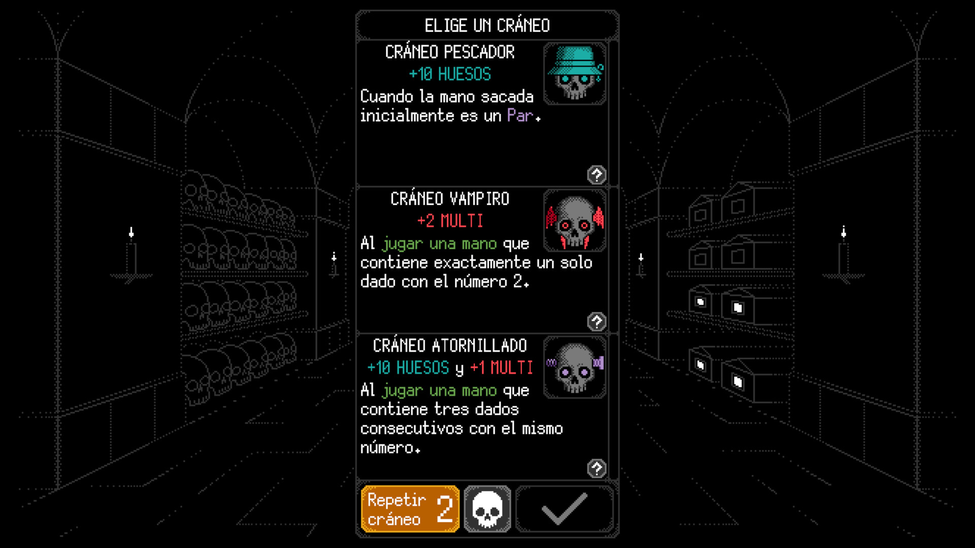 Una vez terminado el “combate”, viene la mejor parte, la de elegir los comodines, que en este caso son calaveras y nos ayudarán tanto añadiendo huesos, multiplicadores o incluso con más descartes. Estoy muy sorprendida con la variedad que hay y, como no podía ser de otra manera, algunas tienen condiciones más sencillas de cumplir que otras. Pero ya os adelanto que os hará pensar muy bien qué clase de build queremos hacernos y estar muy pendientes de qué activamos o no, ya que a lo mejor sacamos una mano que de primeras no nos parece buena, pero gracias a nuestros comodines, puede llegar a ser más alta que otra que parece peor de primeras.