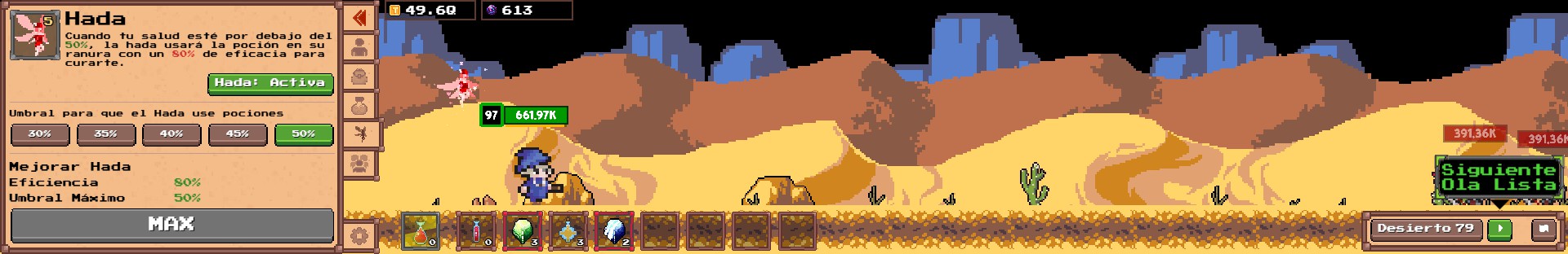Según vayamos mejorando a nuestro personaje, podremos avanzar a niveles más complicados en el mapa. Esto también tiene una opción de dejarlo en automático. El principal problema que he encontrado es que el personaje llega muy lejos y se nos termina llenando el inventario de objetos.