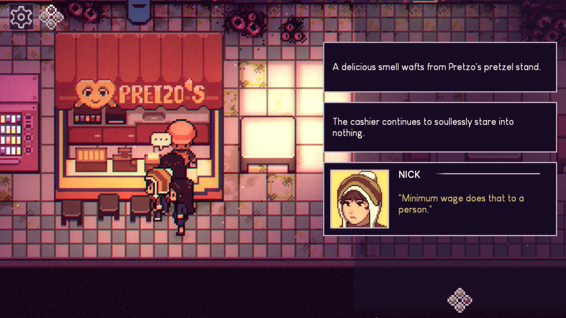 A nivel de ambientación tengo que decir que me ha flipado. El pixelart es precioso, la banda sonora se ajusta muy bien a la ambientación y nos transmite esa sensación de estar perdides en medio de a saber dónde Los toques que tiene el centro comercial, todo lleno de ojos que te observan y el vacío, le dan un punto muy chulo. Espero que esta gente haga más cosas en un futuro porque estoy destrísimo.